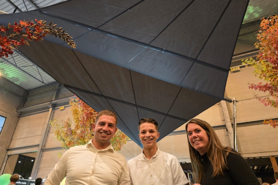 MSK SunSquare is ook nieuw op MidT. Unieke van dit zonnezeil is dat het kan uitklappen. Gepatenteerd systeem, dus uniek in zijn soort. Huub Voogd, Ismay van Lieshout-Voogd en Julian van Aalten zijn er voor alle vragen.