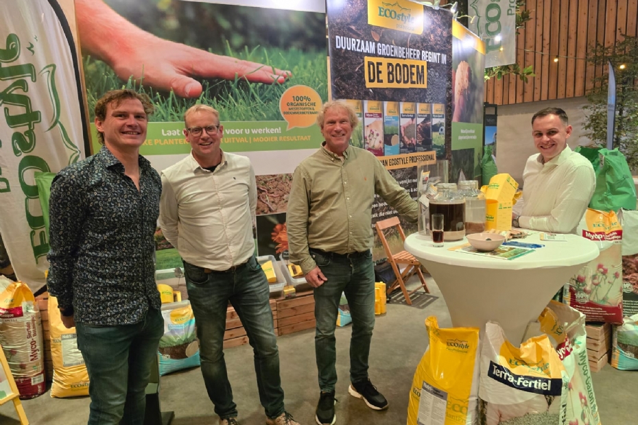 Bram Lips van LipsGroen Hovenier, Ing. Gerwin te Velde, Hans Eildert Van der Wijk en Bart van der Veen ECOstyle. De enige met 100% volledige organische smetstoffen met micro-organismen. Volgend jaar op Hardenberg komen ze met een nieuwe ontwikkeling. Alles binnenkort te lezen in De Hovenier.