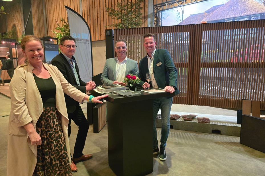 Links Fien Van Rentergem en Loen Lepoutre van Pouleyn, de moedermaatschappij van DJS hekwerken. Naast hen staan van DJS Björn Hermanussen en Bart Brinkhuis. Ze promoten de Pouleyn houten poorten met aluminium platen als synergie van beide bedrijven.