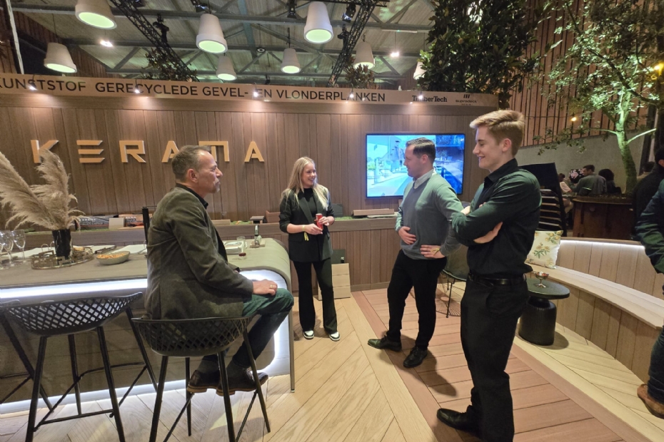 Rob van der Wolf, Daniëlle Beukelaar, Donovan Burk en Dario Burk. Zij staan op MidT om een lijn planken te tonen, die je kunt buigen. Dat kan vooraf, maar ook op locatie. Een echte primeur, deze Supradeck Hollywood en de Supradeck DURA / AZEK lijn van Kerama.