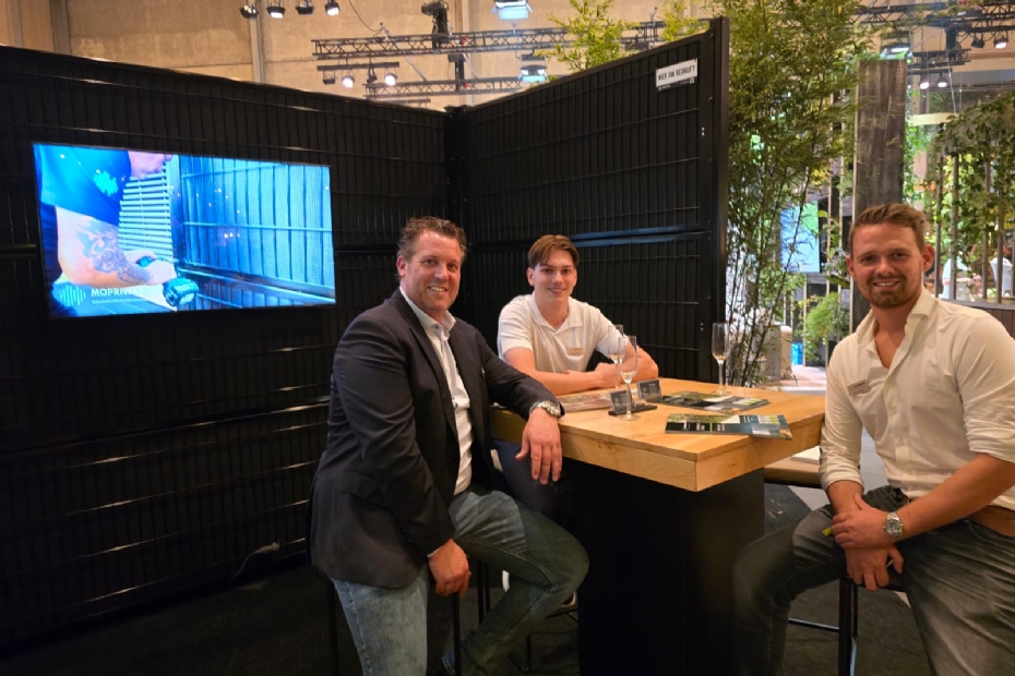 Bram Godrie, Thijs Adriaensen en Juriaan van Keulen van Mopriwand. 'De enige wand waar je stil van wordt... Tenminste, dat denken de buren!' Geluidsabsorberende schermen voor tuin, sport en openbare ruimte.