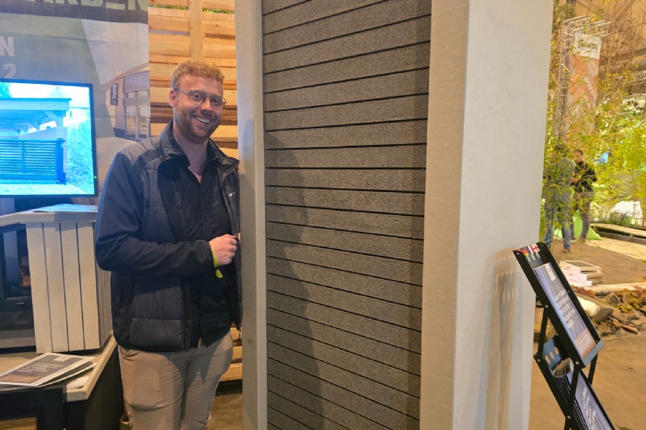 Jordi Jans van Major Garden, nu twee jaar actief in de business en nu al op Meesters in de Tuin. Gespecialiseerd i stalen en aluminium poorten. Sinds kort ook dealer van het nieuwe Nederlandse gevelbekledingsmerk, CladX. De innovatie op gebied van stene, klikbare gevelbekleding. Major Garden introduceert het, als de eerste dealer op deze beurs. CladX word geproduceerd door Luxcom.