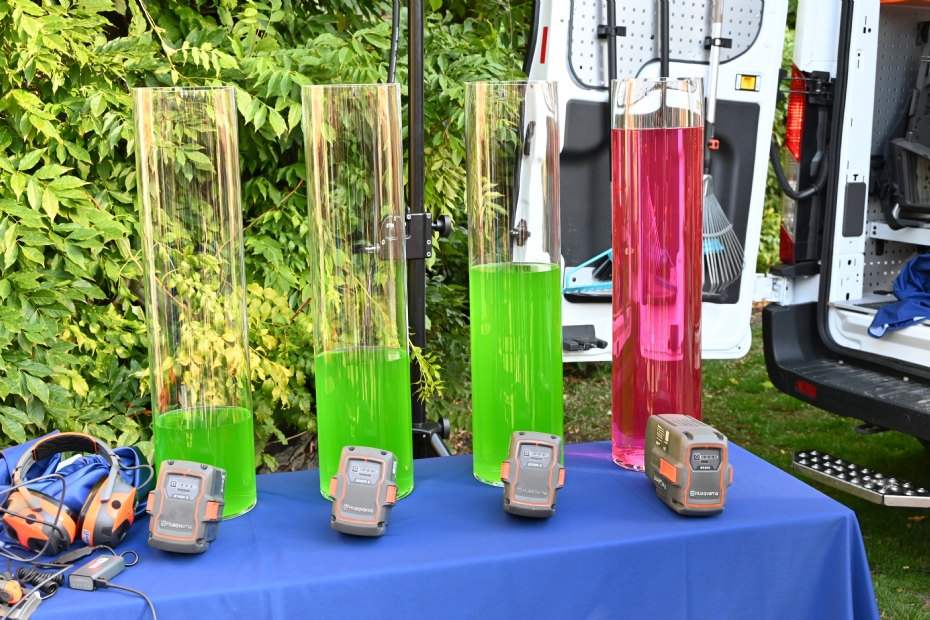 Nieuwe Husqvarna 40-B540X accu helemaal op rechts. Achter de accu's bevinden zich cilindervormige buizen die de hoeveelheid energie of brandstof moeten voorstellen.