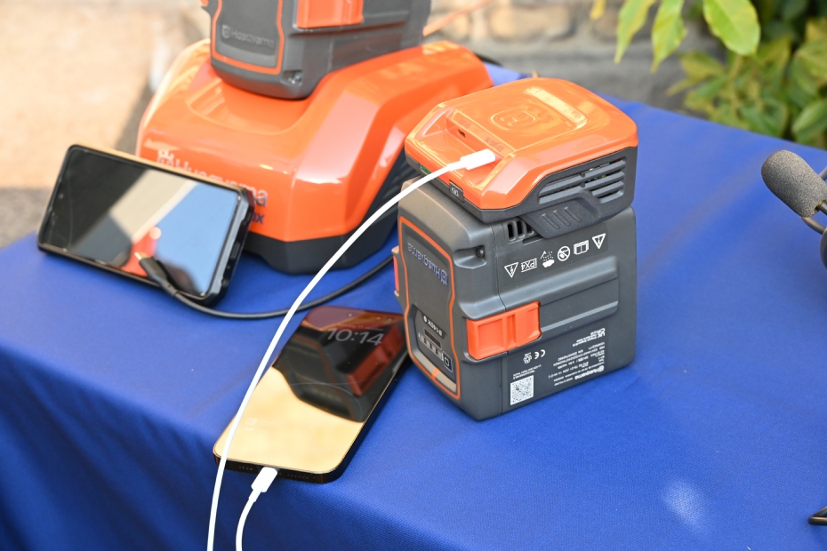 Presentatie nieuwe Husqvarna accu op de achterwand is de nieuwe snellader bevestigd.