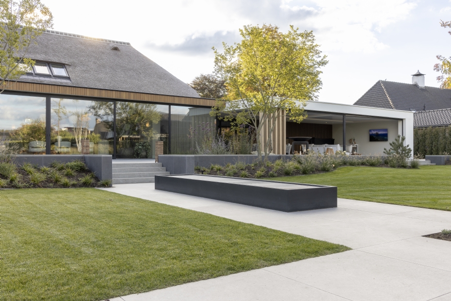 Verder constateert Swanenberg dat de afmetingen van de slabs steeds groter worden. 'We hebben nu bijvoorbeeld keramiekslabs van 1,60 tot 3,20 m in ons assortiment. Deze kunnen van binnen naar buiten worden doorgetrokken. Wel hebben de slabs voor buiten een andere stroefheid.' Hij wijst ook op de eigen zagerij van Stone Base. 'Hier kunnen we met speciale grote zagen figuurzagen, voor grote blokken van 3 bij 2 m. We kunnen er ook mee frezen en trancheren. Dit zijn allemaal bewerkingen die de gemiddelde hovenier niet kan uitvoeren.' De sierbestrating van de specialist in 's-Hertogenbosch is afkomstig uit allerlei windstreken, zoals Italië, Spanje, Portugal, Frankrijk, Brazilië en China. 'Italië loopt voor op de rest van de wereld; daar komen de laatste trends vandaan.'
