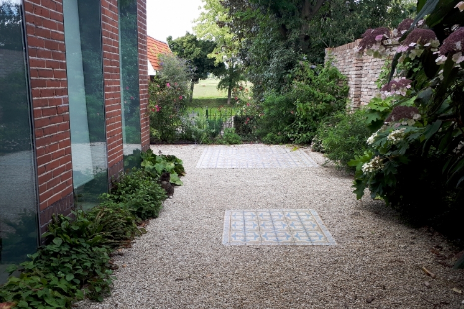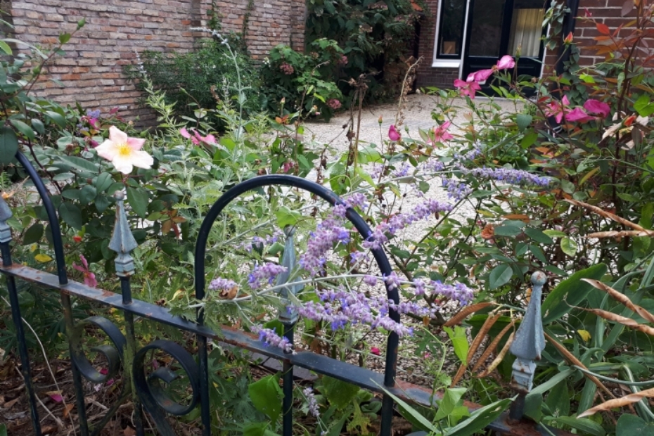 Tegen het huis lag al een verhoogd terras met een tuintrap en een sierhek. Dat alles is behouden maar om de afwatering te verbeteren is de gesloten verharding vervangen door castle-grind in combinatie met enkele antieke tegeltjes. Langs het hek is een vrolijke mix van planten aangebracht met onder andere Lonicera henryi `Copper Beauty', Perovskia, Lathyrus, Rosa `Mutabilis', Erigeron karvinskianus, Fuchsia en Hydrangea `Preziosa', die 's zomers voor kleur zorgen en die voldoende transparant zijn om het uitzicht op het lager gelegen deel van de tuin niet geheel te blokkeren.
