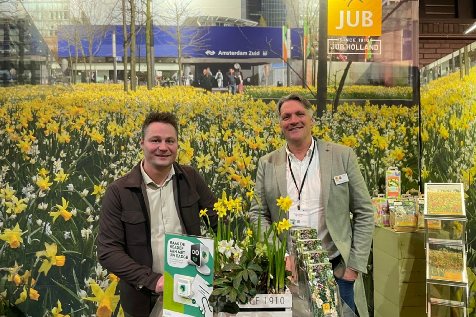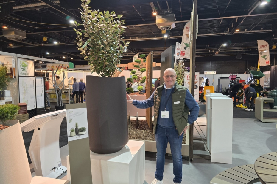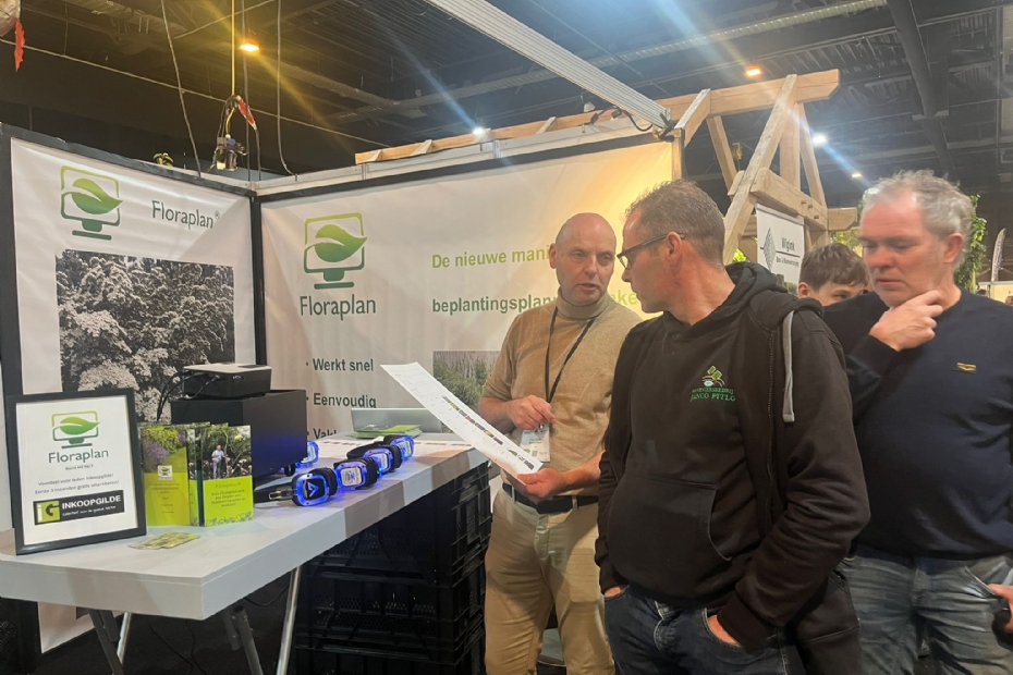 Eddy Rasing van Floraplan vertelt bezoekende hoveniers hoe zij in een handomdraai beplantingsplannen kunnen maken. Het bedrijf werd zo'n twee jaar geleden geïntroduceerd op de beurs, dit jaar kunnen leden van Inkoopgilde Floraplan gratis drie maanden lang uitproberen.