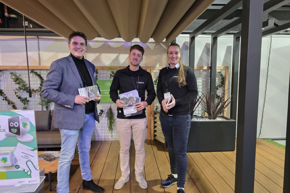 Peter Doornhein van Postmus, en Nik ter Horst en Kim Wenting bemensen bij Luxxout de stand. Nieuw zijn de pergola frames met spotjes, alleen nog maar neerzetten en hup: marge maken! Want alles is voorbereid. Postmus is dealer van Luxxout, Postmus is een Nederlandse bedrijf gespecialiseerd in tuinproducten en -inrichting, met een breed aanbod van sierbestrating tot tuinmeubelen.