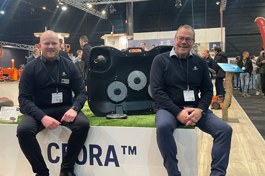 Falko Fennema (l) en Bart van Hal (r) van Husqvarna zijn verwachtingsvol voor het nieuwe jaar: 'Dit wordt echt het jaar dat robotmaaiers gaan doorbreken in professionele toepassingen voor golf en sport.'