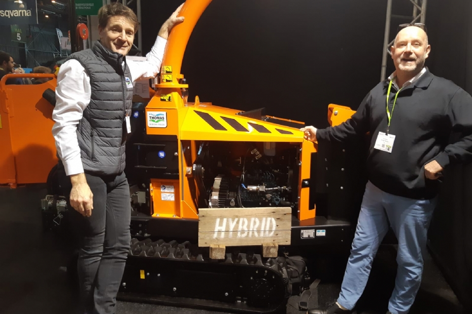 Seb Merckx (links) en Jos Stoop laten met gepaste trots de hybride hakselaar op rupsbanden van Timberwolf zien. Deze machine kan hout met een grote diameter hakselen dankzij het extra vermogen van de elektromotor en heeft zeer weinig emissies. Ook het opstarten na een onderbreking verloopt soepel met deze machine.
