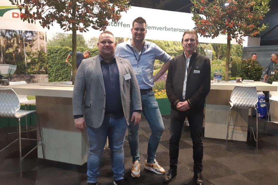DCM met rechts Aldert Engelsman heeft als highlight onder andere de innovatieve organische meststoffen Liquid Green: morgen mooi groen gras als je bijvoorbeeld een bruiloft hebt en het gras staat er geel bij. Verder een keur aan meststoffen in minigran korrels voor een optimale spreiding.