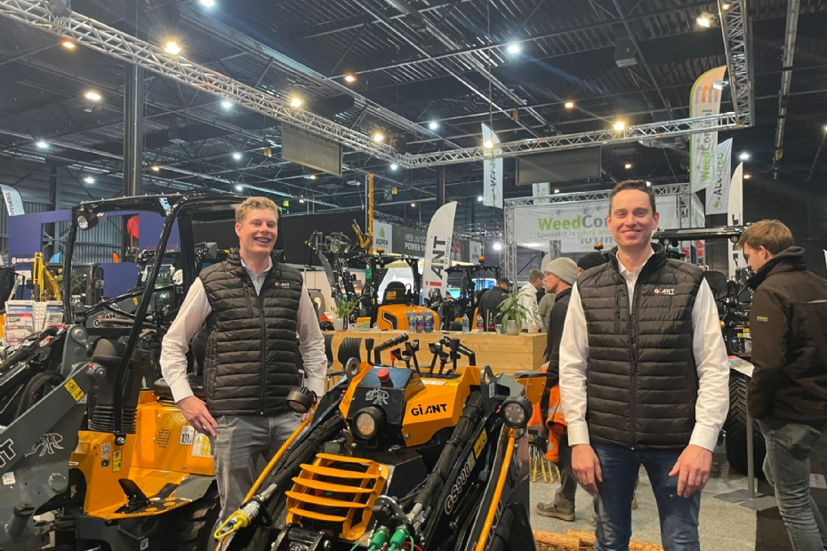 Simon Peters en Luuk van Kessel (r) bij de nieuwe elektrische GIANT GS900E Skidsteer: 'ook op rups met 22 KWHaccu.'