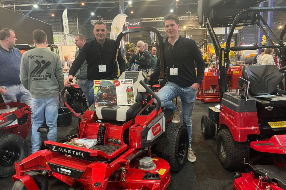 Jesse Kool (r) en Gerhard Teunissen van Heybroek bij de nieuwe accu aangedreven zeroturn Z-Master Revolution van Toro: 'voor het serieuze (en stille) hovenierswerk.'