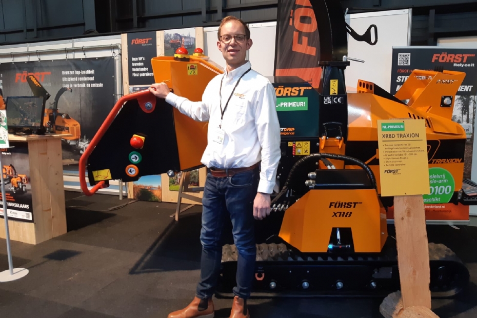 Bernard Nieuwenhuis van Först Nederland poseert voor het paradepaardje: de XR8D Traxion versnipperaar op rupsbanden die met gemak op een schuin talud kan werken. Uniek in Nederland. Ook de bestseller machines zijn meegekomen naar de beurs, terwijl in de achtergrond wordt gewerkt aan de e-versnipperaar.