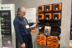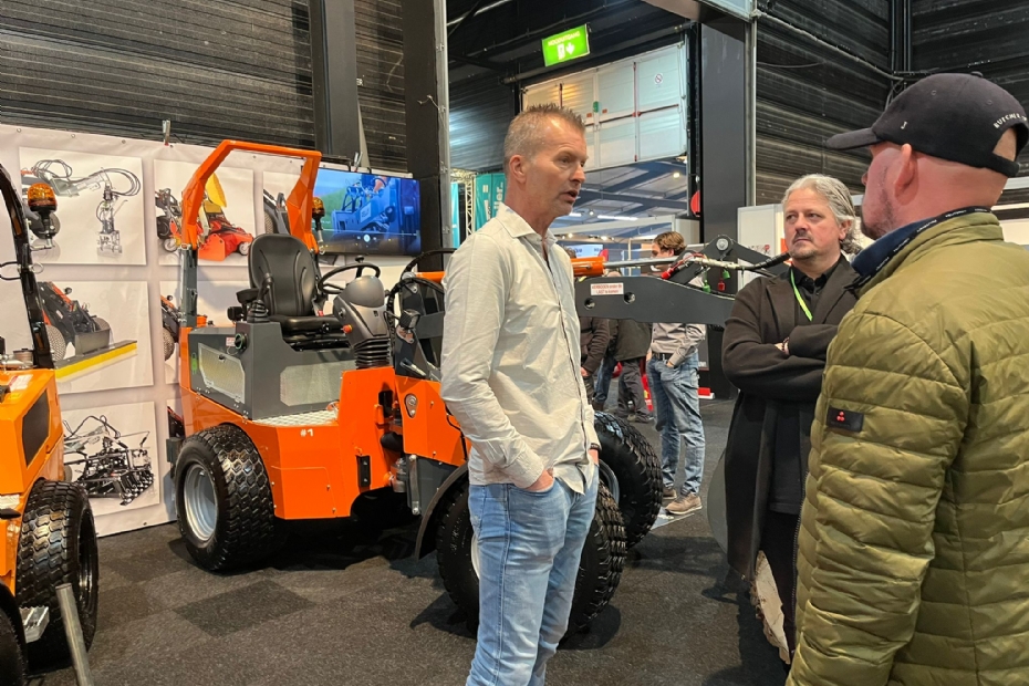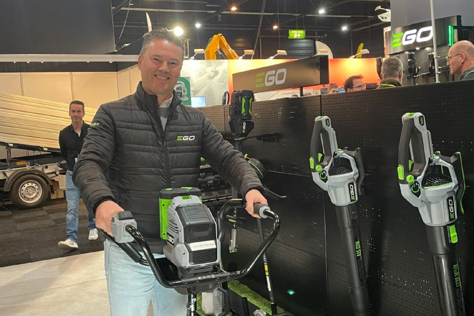 Gerco de Graaf, werkzaam voor de fabrikant van Ego op de stand van importeur Stierman de Leeuw: 'Wij staan nu voor het tiende jaar op de Groene Sector Vakbeurs. We zijn met zes machientjes begonnen en we hebben er nu meer dan 100! Op de stand deze beurs: 18 verschillende innovaties en nieuwe machines.