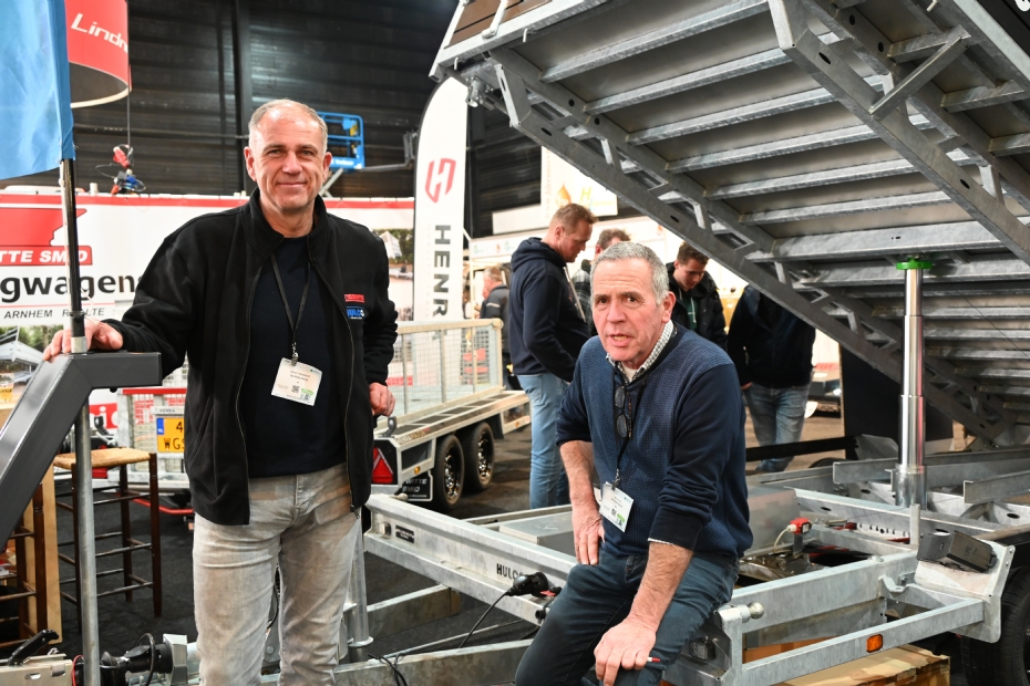 Een echte beursprimeur bij De Witte Smid, Vasco Westerhof (l) en Jan Koop van De Witte Smid poseren bij het nieuwe prototype model kiepwagen; de Benax van Hulco. Een primeur want het model is nog niet aan het publiek geshowd, vanaf maart is het model officieel leverbaar. De bruto adviesprijs is vanaf 9.375 euro, nu op de beurs verkrijgbaar met een mooie beurskorting. Informeer bij de heren in hal 5 voor de aanbieding.