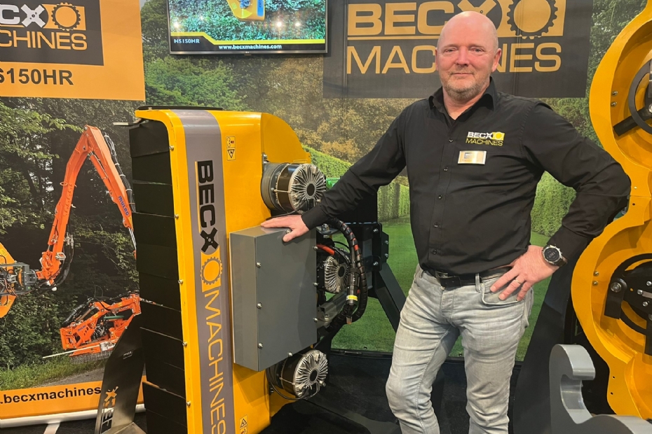 Erwin Hommen van Becx Machines staat bij het nieuwe prototype van de HS131ER, een volledig elektrische heggensnoeier. Het normale model is hydraulisch, de nieuwe is met elektromotoren en een accupakket uitgerust. De bedoeling is dat deze op iedere willekeurige werktuigdrager kan monteren en zo volledig elektrisch kan snoeien.
