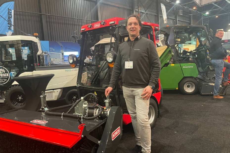 Frans Drost van Nimos op de stand van hun distributeur Heybroek met de vernieuwde Posi-Trac en rolbezem. Uiteraard ook electrisch aangedreven. Nieuw is de Posi-Trac K-216. De machine heeft een batterijpakket van 62 KWH! De bezem op zijn beurt is ook leverbaar op de RECO e-trac.