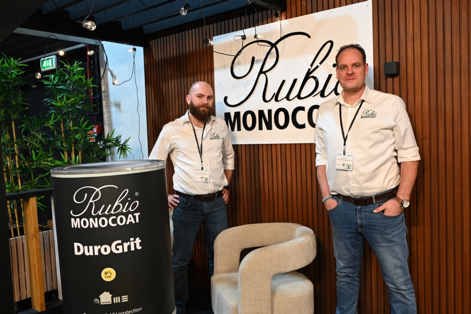 Sjoerd Bos en Melvin van Eijk van Rubio Monocoat garanderen dat hun product 'in één laag dekt'. De Monocoat is verkrijgbaar in 14 kleuren, inclusief zwart, waarbij het ook die beloofde dekking met één laag biedt. Zwart is direct een van de populaire kleuren, naast de natuurlijke tinten. Het product bestaat al 16 jaar en is inmiddels goed bekend in de interieurbranche, maar nog relatief onbekend in de hovenierssector. Ondanks dat bieden ze een volledige buitenlijn aan, waarvoor ze nu de aandacht vragen.