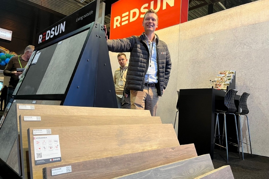 Emile Koning van REDSUN bij de nieuwe collectie woodlook, in zowel CeraSun uitvoering -dus keramische toplaag verbonden met betontegel- als volledig keramiek tegel.