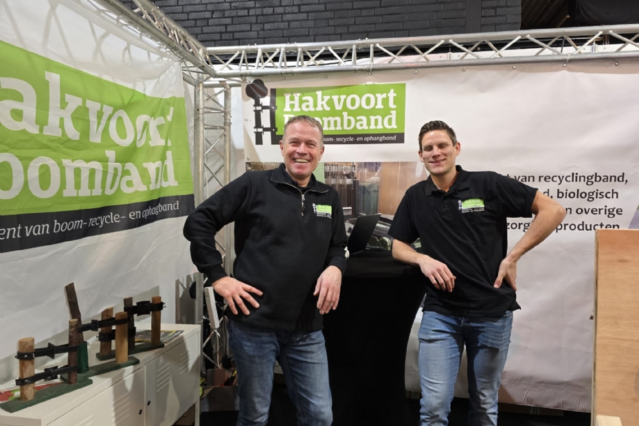 Luciën van Leijen en Roel Koppes van Hakvoort Boomband (onderdeel van de Alise Group), nieuw op de vakbeurs, zijn de dealer van Nederland van Ecorub geworden, rubberen producten van gerecycled banden.