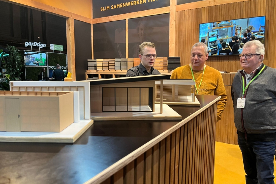 Bij Van Dorp Hout worden de nieuwste modellen op schaal bewonderd door bezoekers. Ze zijn deze week binnen gekomen aldus directeur Henk-Arie Schra: 'Hiermee kunnen hoveniers ook op pad om hun klanten te laten zien wat er mogelijk is op het gebied van houtbouw.'