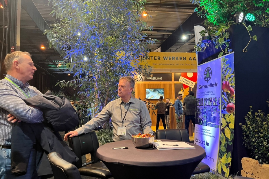 Fred de Koning van Greenlink informeert bezoekers over de aandachttrekkende eucalyptus bomen: Eucalyptus camaldulensis 'Rostrata'. Geen nieuwe soort maar Greenlink staat wel een beetje bekend om het wat meer bijzondere assortiment. Bovenin de stand staan ook nog twee aardbeienbomen: Arbutus unedo, een plant die zowel kan uitgroeien als boom maar ook heester.