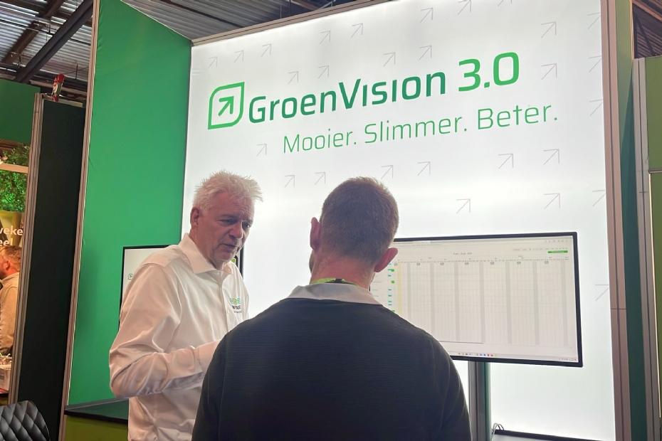 Directeur John Willemsen van InfoGroen legt een bezoeker uit over de voordelen van het vernieuwde GroenVision 3.0.