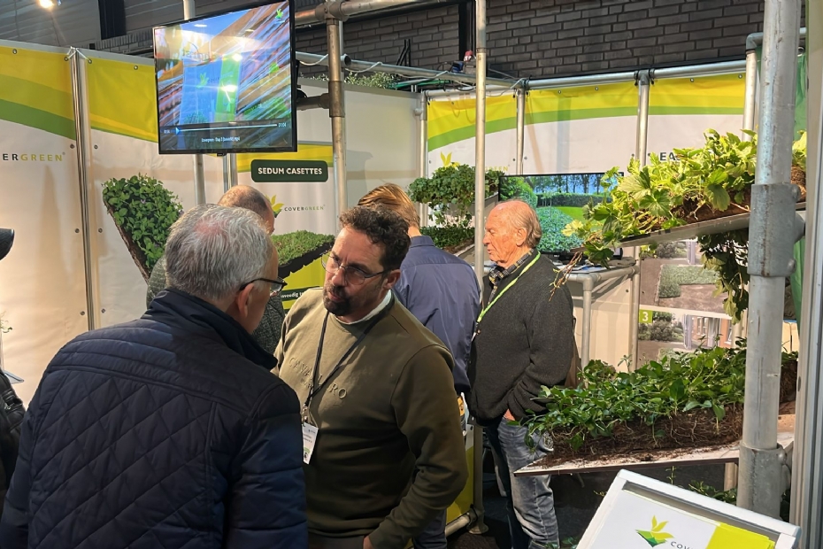 Een bomvolle stand bij Covergreen. De kant en klare plantenmatten zorgen direct voor een mooi beeld waar onkruid geen kans krijgt. Nieuw is de mat met Delosperma Cooperi (ijsbloem) een sterke paars bloeiende bodembedekker.