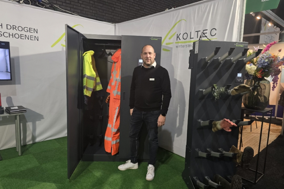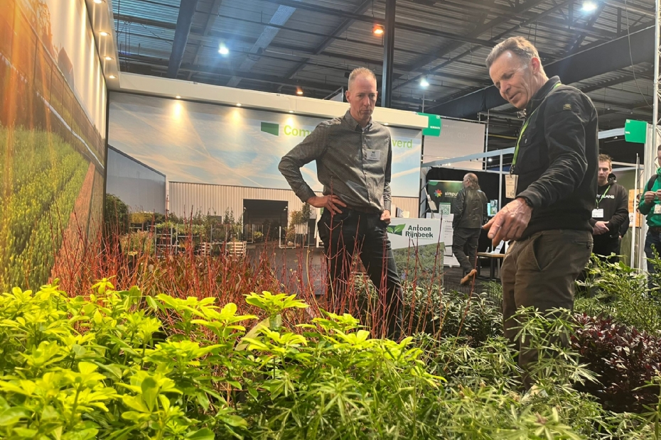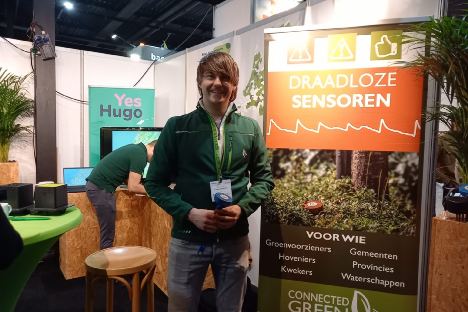 Tom van Urk, Connected Green: 'We geven deze beurs aandacht aan ons concept 'Betere nazorg, minder kosten'. Met onze bodemvochtsensoren is exact te meten welke beplanting water nodig heeft en welke niet. Dat kunnen we op afstand monitoren. Erg leuk om te merken dat veel standhouders hier ook nieuwsgierig zijn.'
