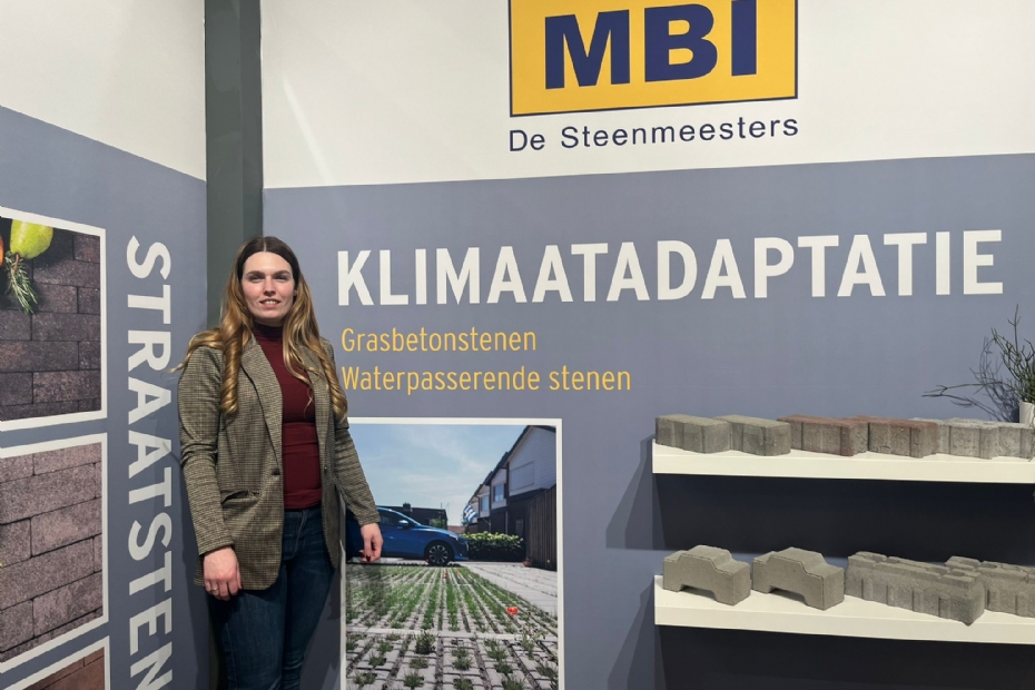 Accountmanager Guusje Kuijpers van MBI de Steenmeesters. MBI lanceert in dit nieuwe jaar diverse nieuwe uitbreidingen qua kleuren en formaten. Zoals binnen de instaptegel, de Trippel T, komt er een 80 x 80 formaat bij in 4 en 6 centimeter. De GeoCorso komt ook met drie nieuwe kleuren én 80x80. Vanaf februari dit jaar allemaal leverbaar. Binnen GeoCeramica, het meest bekende en succesvolle tegelconcept van MBI is het assortiment iets ingeperkt, maar is het wel aangepast aan de laatste trends. Kuijpers: 'Leuk om te zien hoe de vraag naar waterpasserende bestrating meer en meer doorstroomt naar de particuliere tuin. Al blijft het voorlopig wel veelal voor opritten en parkeergelegenheid.'