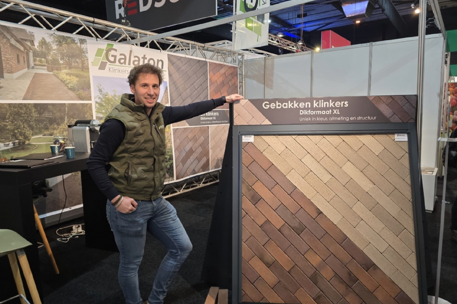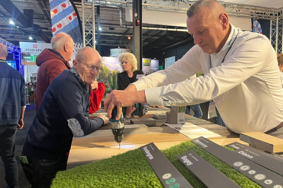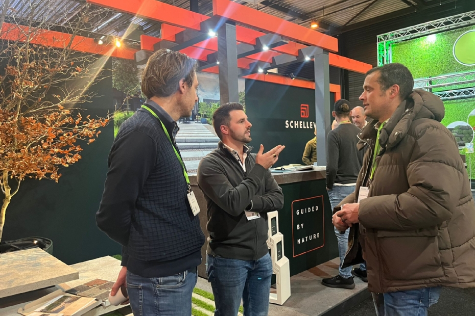 Accountmanager Hidde Vermaas van Schellevis informeert bezoekers over de gloednieuwe Schellevis Groenwand, een concept waarbij je met stapelstenen met kenmerkende Schellevis structuur, afscheidingen kan creëeren waarin ook ruimte is voor groen. De echte lancering is in februari, verkrijgbaar in de kleur grijs. De stapelelementen zijn in drie verschillende formaten. Daarbij komen er in 2025 ook nieuwe waterpasserende verharding.