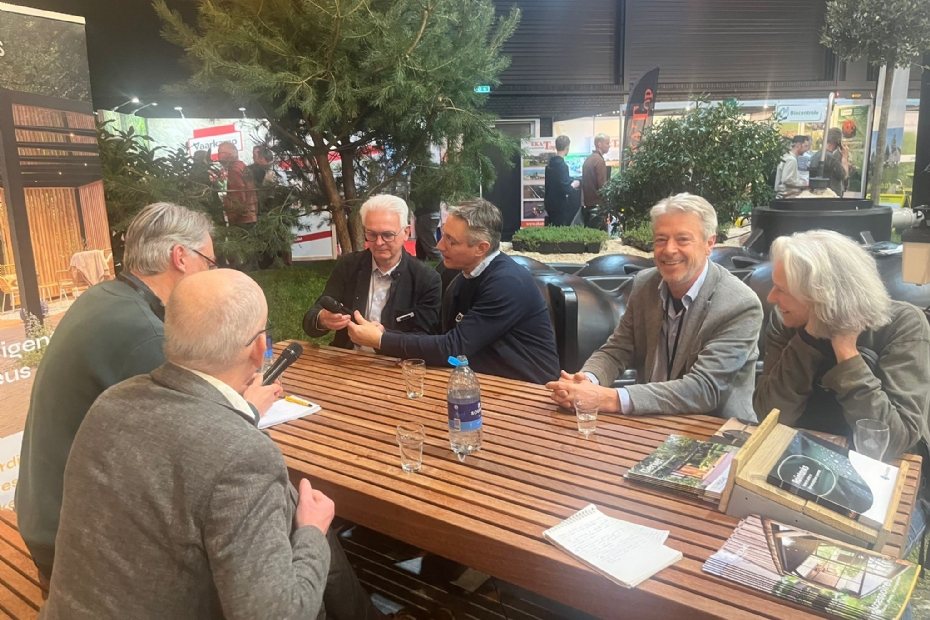 In de tuin van de toekomst een ronde tafel gesprek, aan een vierkante tafel, over de meerwaarde van duurzaamheid. Aan tafel onder andere Ruud Snijders van Innogreen, Wim van Veldhuizen van Husqvarna, Nico Wissing NL Greenlabel.