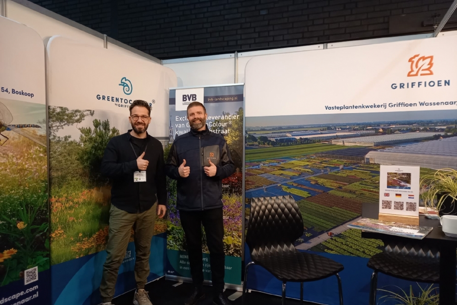 Jarno van Veelen, BVB Landscaping, staat hier samen met Griffioen Wassenaar. Er is een nieuwe samenwerking. 'Een goede bodem is essentieel voor mooie planten en een goed eindconcept. Sinds een maand of twee zijn we exclusief leverancier van Griffioen voor het Green to Colour by Griffioen vaste planten concept. We ontwikkelden samen verschillende substraten voor uiteenlopende toepassingen en bodems. Daarnaast gebruiken we grote potmaten.' Joris van Tol, Griffioen: 'Er zijn vier projectstappen: we maken een ontwerp en bepalen welke planten het beste passen in een bepaalde situatie, dan welke bodemverbetering nodig is, dan wordt de beplanting aangebracht en tenslotte is er een onderhoudsprotocol. Wordt alles juist uitgevoerd, dan geven we ook garantie. Die projecten mogen onze naam dan dragen.'