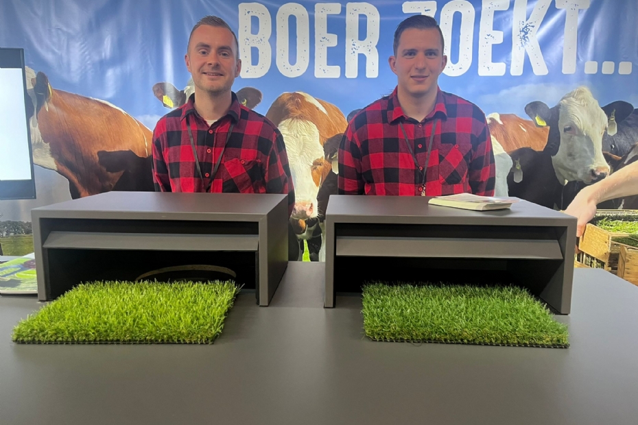 Bij Kunstgrasboer poseren Bauke de Vries en Corstiaan Bol bij het kunstgras met Colorshift Technologie. Deze innovatie werd vorig jaar gelanceerd op de beurs. Helaas, door productie vertraging was deze pas juni 2024 leverbaar. Dit jaar wordt er dus voor het eerst een volledig aanlegseizoen mee gedraaid.