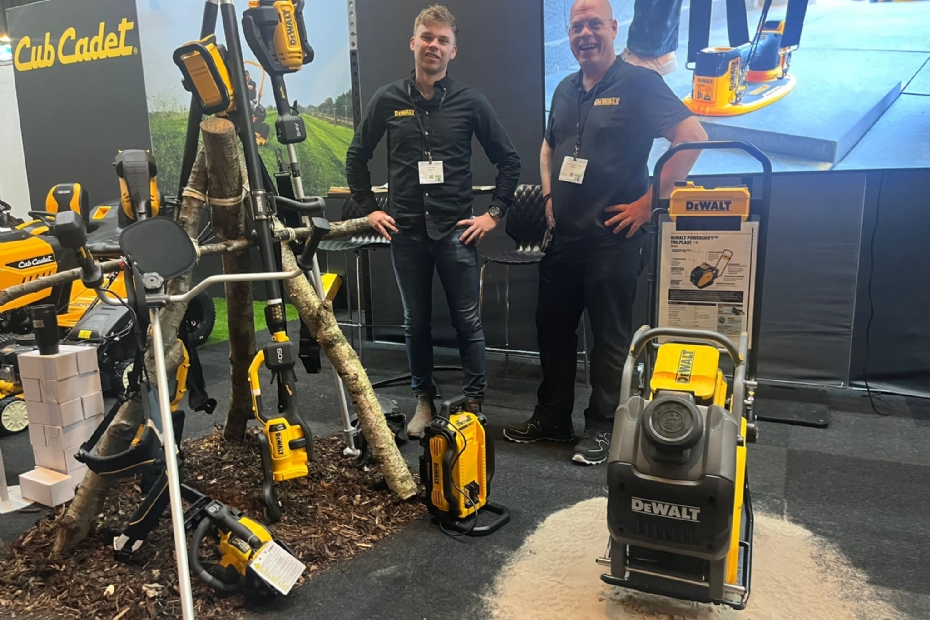 Wouter Rook (l) en Marcel van den Berge van DeWalt bij de Powershift Trilplaat, de allereerste trilplaat op een gloednieuw accuplatform. Extra grote accu's voor de krachtigere machines, 54 volt en 554 wh. Op Hardenberg de prelaunch van de machine, die vanaf februari leverbaar is in de Benelux. Daarbij heeft het Amerikaanse bedrijf ook een nieuwe lijn voor de professionele groene vakman: kettingzagen, bosmaaiers, bladblazers, grasmaaiers en meer.