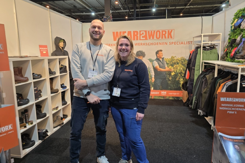 Stefan van Willigenburg en Elise Verwoerd van Wear2work. Eerste keer op de beurs, en zijn er voornamelijk voor de naamsbekendheid. Doorlopende nieuwe producten. One-stop-shop voor de hippere werkschoenen en werkkleding.
