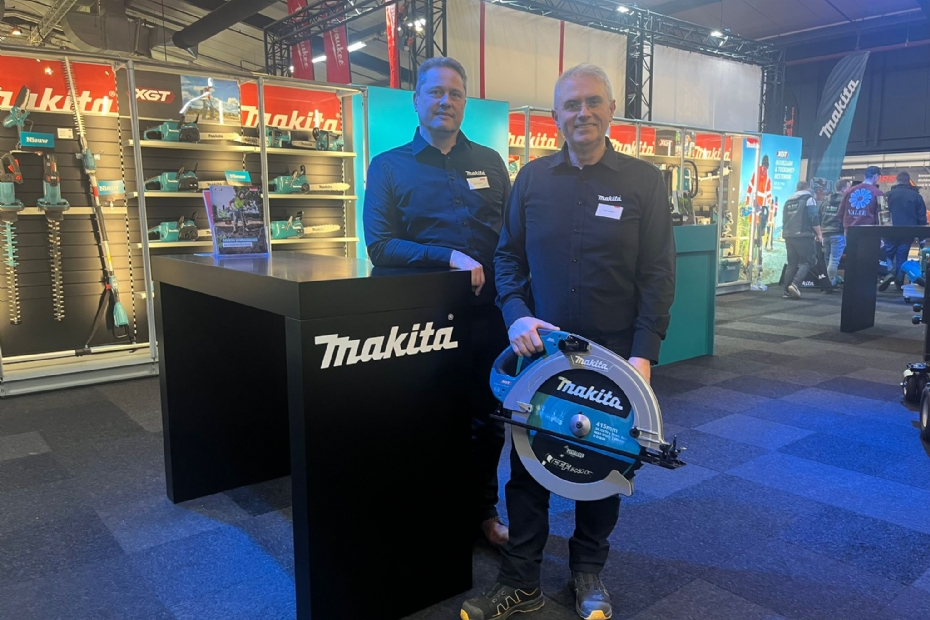 Arjen Peeters en Suad Muhovic met de Makita HS013G, 's werelds grootste handcirkelzaag op accu. Peeters: 'Deze is echt vers van de pers, uit vanaf 1 januari 2025 en ookal leverbaar.' Zaagblad van 415 mm, met een maximale zaagcapaciteit van 158 mm. De douglasbalken van 150 bij 150 kun je hiermee in één keer doorzagen, ideaal voor hoveniers die veel werk hebben in houtbouw.'