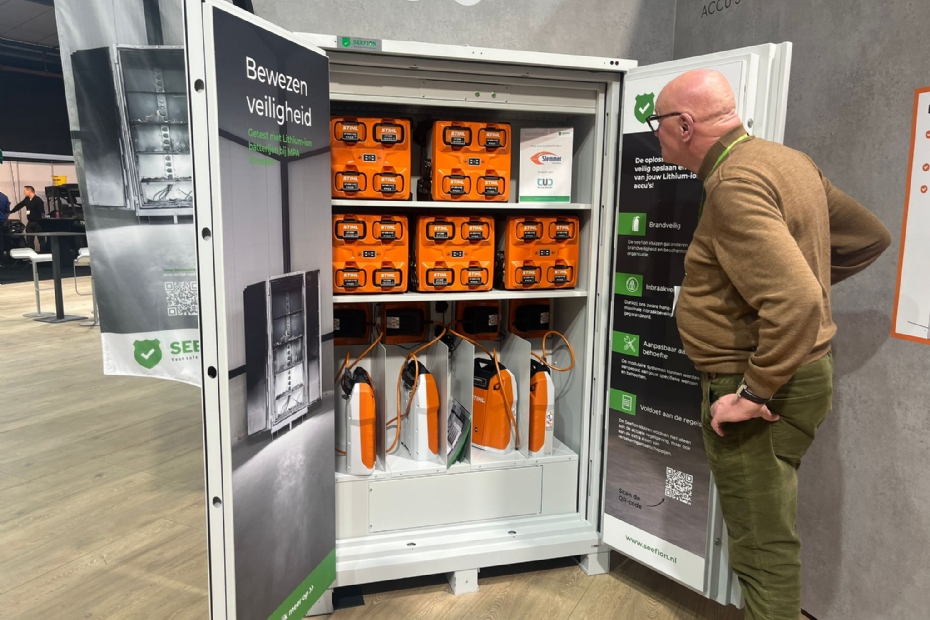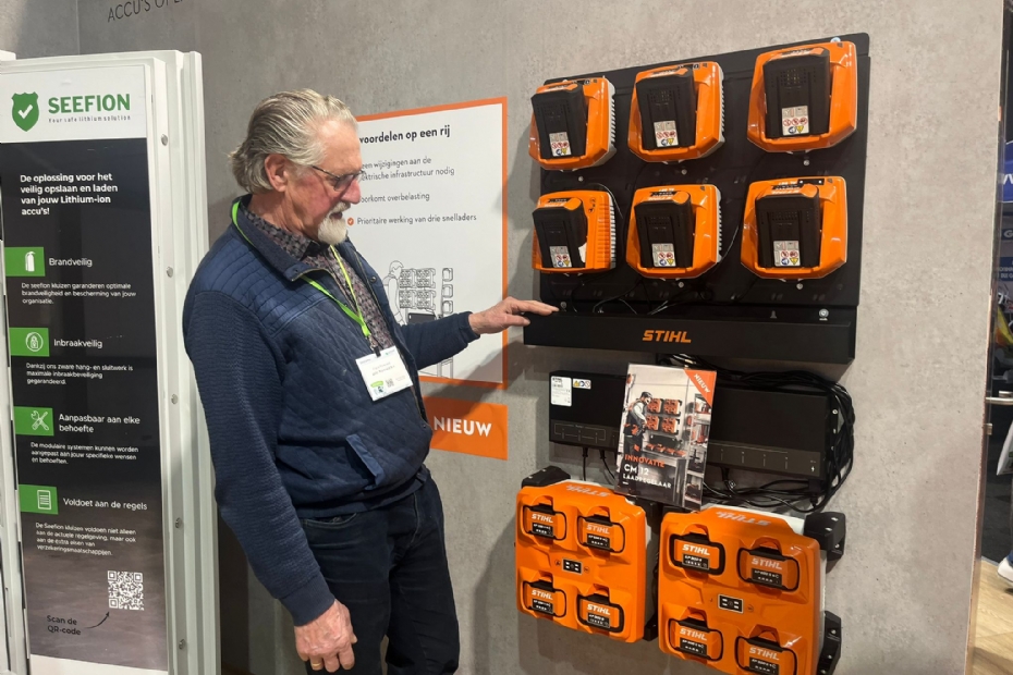 Bij Stihl bewondert een bezoeker de Stihl CM-12, een laadregelaar. Dat is een slimme laadoplossing voor rondslingerende opladers en accu's. Want hiermee kan je op één stopcontact tot wel 48 accu's opladen binnen acht uur. De innovatie was genomineerd voor de innovatie awards van de beurs, én behaalde daar ook een podiumplaats.