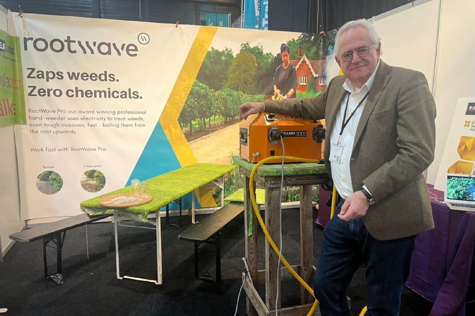Gerrit van Nieuwenhuizen van Ramm bij de prijswinnende Ramm3000. Deze machine is in samenwerking met Wageningen University & Research ontwikkeld en is bedoeld om met elektriciteit onkruid te doden. Met de Ramm3000, die ook al te zien was op GroenTechniek Holland, bedient Ramm een nieuwe doelgroep. De machine zal in het voorjaar van 2025 op de markt worden gebracht.