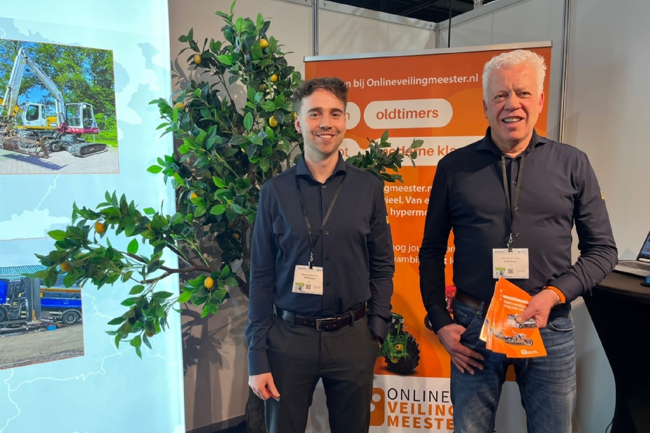 Bij Onlineveilingmeester.nl is er een leuke beursactie. Je mag raden wat het hoogste bod is van de Fendt 410 Vario waarvoor hij weggaat op de veiling. De bezoeker die het goede antwoord raad wint een tegoedbon van 250 euro om zelf machines te veilen: veiling tegoed. Op de foto Herman de Jong en Marne Oosterhuis (l).