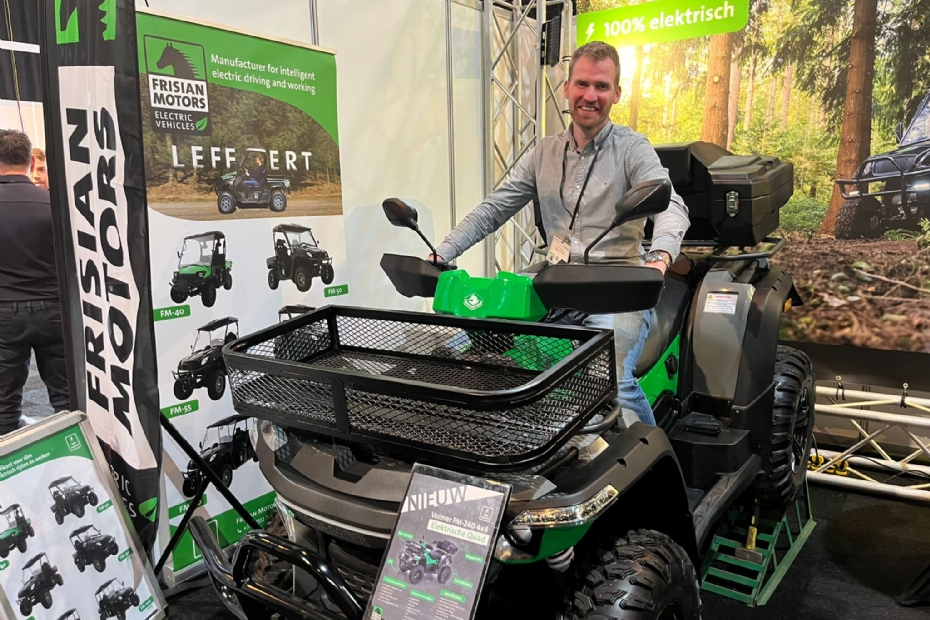 Stefan Stokebrook van Frisian Motors zit op de nieuwe elektrische Volmer quad. Deze werd eind 2024 gelanceerd op GTH. Stokebrook: 'Op de beurs goede en interessante reacties gehad op onze elektrische quad.'