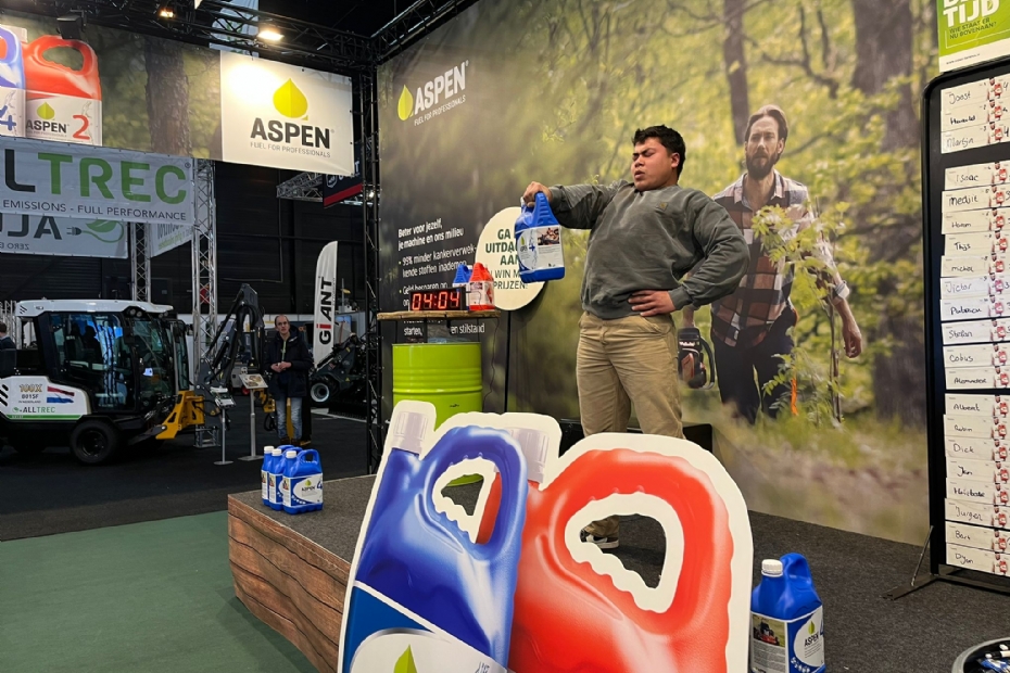 Deze beursbezoeker wist op de derde dag maar liefst 5.02 minuten een kannetje Aspen omhoog te tillen. Hiermee behaalde hij de eerste plek met ruim 15 seconden voorsprong op nummer twee.