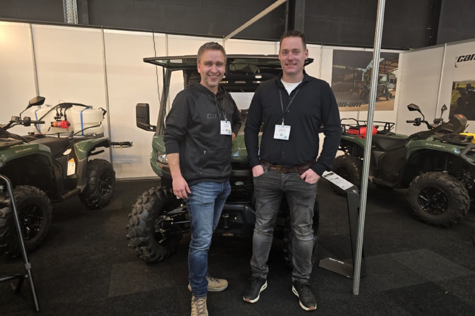 Meo Jochemsen van Quadwinkel en Wilco de Jong van ATV Specialist op de stand van Can-Am, voor de nieuwe Traxter. Rijdt als een tijger!