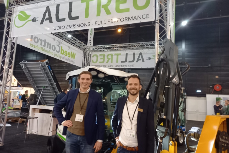Bij Weed Control staat de AllTrec 8015F, een multifunctionele en zero emissie elektrische werktuigdrager, in de spotlight. Weed Control is specialist in gifvrij onkruidbeheer en dealer van AllTrec. Jos Kleinloog, nieuw bij het salesteam van Weed Control (rechts op de foto): 'De laatste jaren is er ingezet op de uitbreiding van de functies van de AllTrec 8015F, zodat deze gedurende het hele jaar ingezet kan worden. Voorheen kon de machine maaien en borstelen, nu kan die ook hagen snoeien. Met een arm van 2.70 meter en 1.30 meter aan maaidek en een accu die voor de hagensnoeier wel twee dagen meegaat, is dit een interessante machine. De eerste tien zijn geproduceerd en daar zijn er zes van uitgeleverd. We kunnen er dus nog een paar snel leveren, maar na de beurs zijn ze vast en zeker weg. Verder blijven we doorontwikkelen op vragen van klanten.'