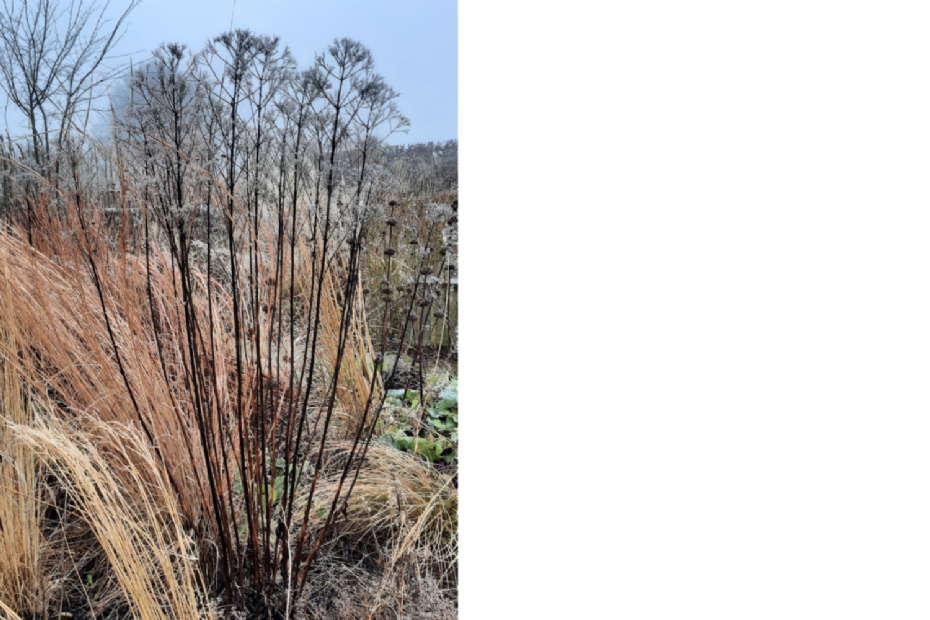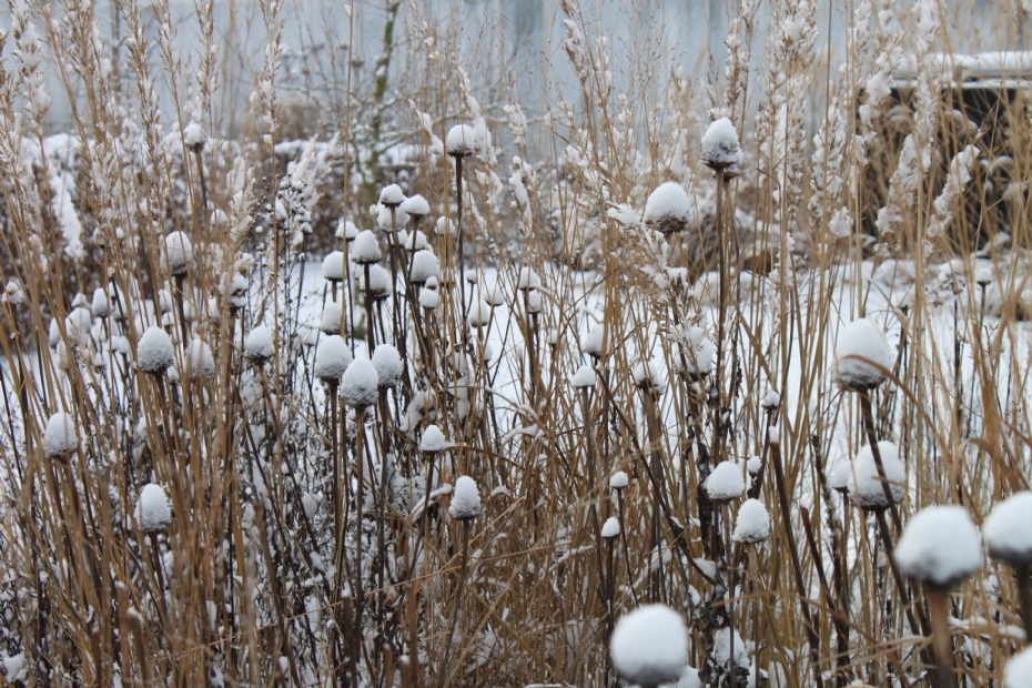 Bloeivormen en zaaddozen waarop de sneeuw blijft liggen. Zonnehoed (Echinacea purpurea) verandert in een sneeuwhoed; gecombineerd met Calamagrostis brachytricha ben je ook in de zomer zeker van een indrukwekkende combinatie.