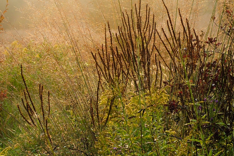 | | Speel in deze maanden met het (tegen)licht van de laagstaande zon. De aren van grassen zijn heuse meesters in het vangen van licht. De donkere aren van Veronicastrum steken mooi af tegen ijle, transparante siergrassen. Gecombineerd met een hoge Molinia arundinacea, zoals 'Windspiel', of 'Transparant' met iets meer doorkijk, ontstaat er een spannend beeld waar je geen genoeg van kunt krijgen. |