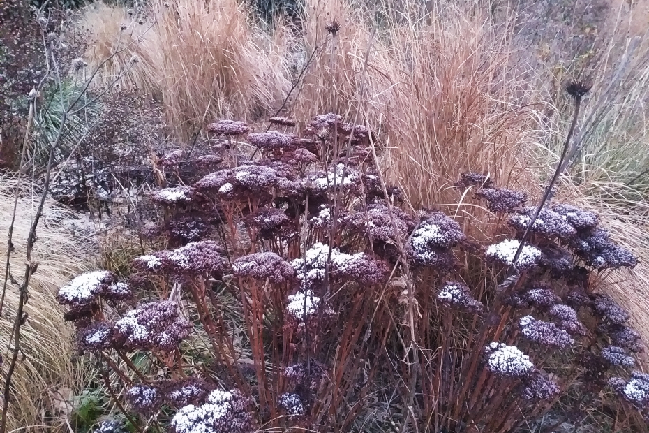 | | Bloeivormen en zaaddozen waarop de sneeuw blijft liggen. Zonnehoed (Echinacea purpurea) verandert in een sneeuwhoed; gecombineerd met Calamagrostis brachytricha ben je ook in de zomer zeker van een indrukwekkende combinatie. |