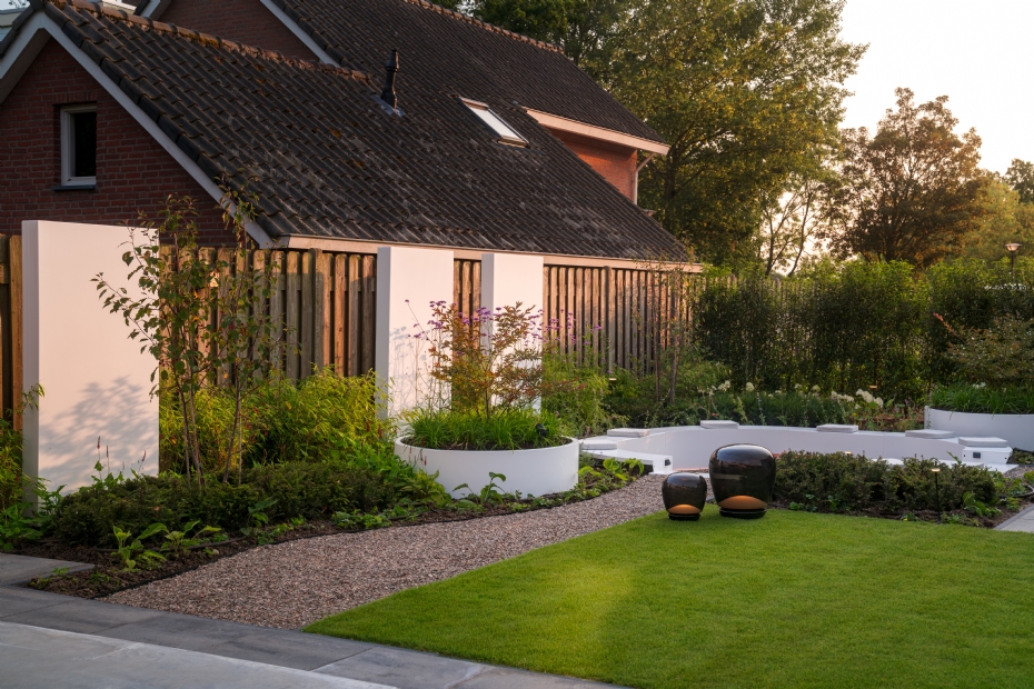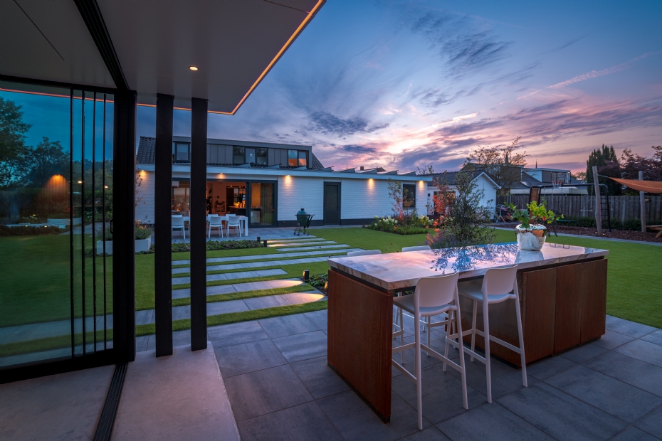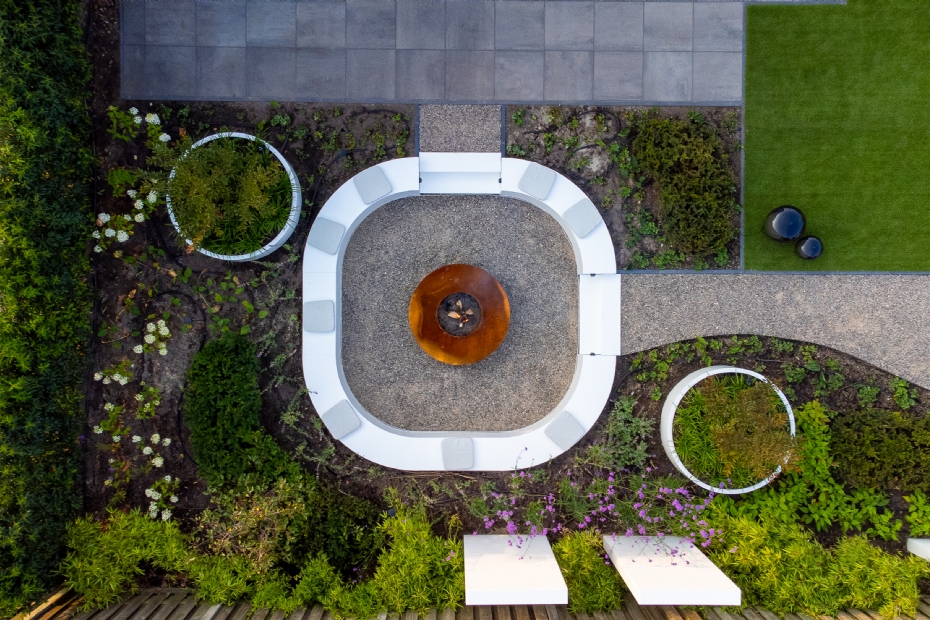 'Of mensen meer geld opzij leggen voor hun tuin? Ze geven er zeker meer geld aan uit dan voor de coronatijd en ook meer dan twee jaar geleden. Maar besef wel dat de hogere prijzen van materialen en de inflatie ook voor prijsstijgingen heeft gezorgd. Alles is duurder geworden in de afgelopen jaren.' Het valt Broos op dat steeds meer klanten een buitenkeuken willen. 'Outdoor cooking is een trend. FORNO uit Uden, een dochteronderneming van Adezz, heeft een groot aanbod op dit gebied waar we dankbaar gebruik van maken. Zo hebben we onlangs in een tuin van een klant in Oud-Gastel, dicht bij Roosendaal, een vuurtafel van FORNO geplaatst.' De vuurtafel heeft een ronde vorm en is gemaakt van cortenstaal dat, naarmate de tijd vordert, een diepe roestbruine kleur krijgt. 'Voor deze klant, die een gezin met drie kinderen heeft, mochten we zowel een zitkuil aanleggen met een vuurplaats, een terras waar buiten gekookt kan worden, als een buitenverblijf.' Veel van het tuinmeubilair, zoals die voor outdoor cooking, de stoelen en tafels, komen van FORNO en Adezz. 'Het is fijn dat we dat bij één bedrijf kunnen halen, want de klant wilde dat alles goed op elkaar afgestemd is. Om onze klanten een goed beeld te geven van hoe hun tuin eruit gaat zien, hebben we het tuinmeubilair nagetekend met ons tekenprogramma. De grote witte plantenbakken in deze tuin in Oud-Gastel zijn ook van Adezz. De klant koos zowel voor ronde als vierkante bakken.' In de tuin staan ook witte panelen die uitgelicht kunnen worden en het gevoel van eenheid versterken.