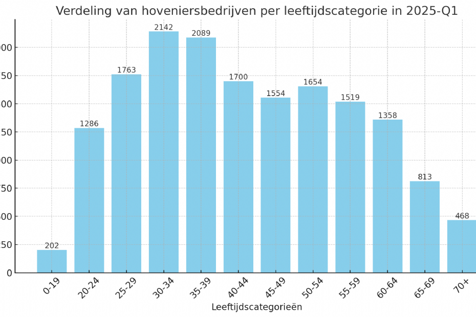 Ongeveer 25,1% van de hoveniersbedrijven heeft een oprichter die 60 jaar of ouder is. Dit betekent dat een kwart van de ondernemers in deze sector binnen zeven jaar de pensioengerechtigde leeftijd bereikt. Hoewel dit een aanzienlijk percentage is, vormen ondernemers tussen de 30 en 39 jaar met 25,6% een net iets grotere groep. Dit is te verklaren door de forse groei van het aantal bedrijven in de sector, vaak opgericht door jongere mensen. De toename van het aantal hoveniersbedrijven bedraagt bijna 32% in slechts vijf jaar tijd, volgens de inschrijvingen bij de Kamer van Koophandel.